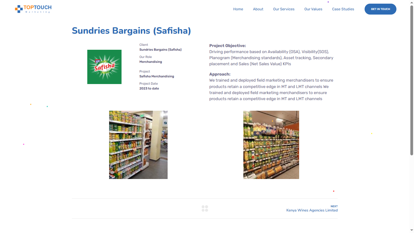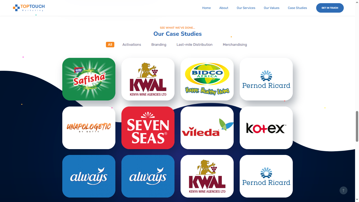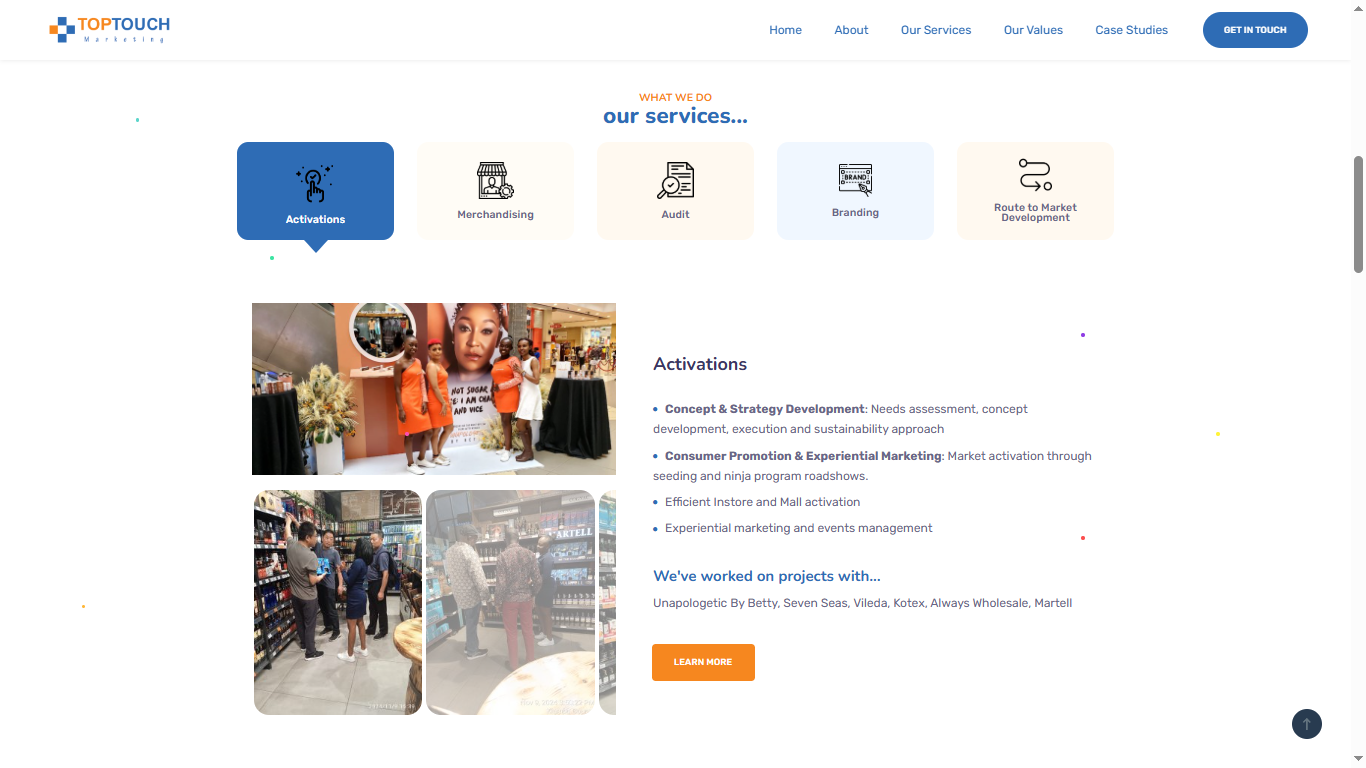 TopTouch Marketing Ltd features a services showcase to highlight its expertise in activations, branding, and merchandising, along with a detailed project showcase,